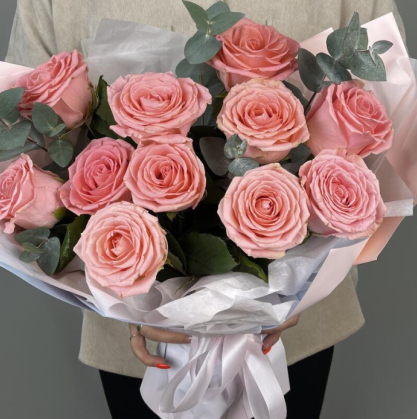Буукет 11 розовых роз с эвкалиптом | Купить с доставкой в Подольске