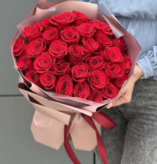 Состав: 21 кенийская роза (красные, розовые, белые), декоративная зелень, упаковка.