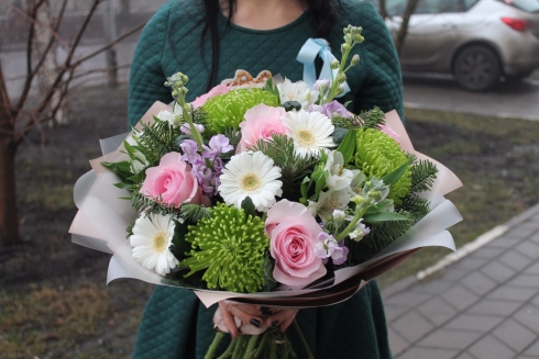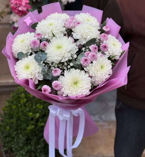 Заказывал букет "Хризантемы и герберы" увеличенный. В итоге букет выглядел даже лучше, чем ожидалось!