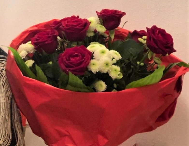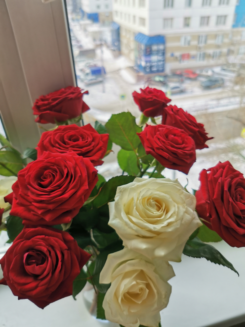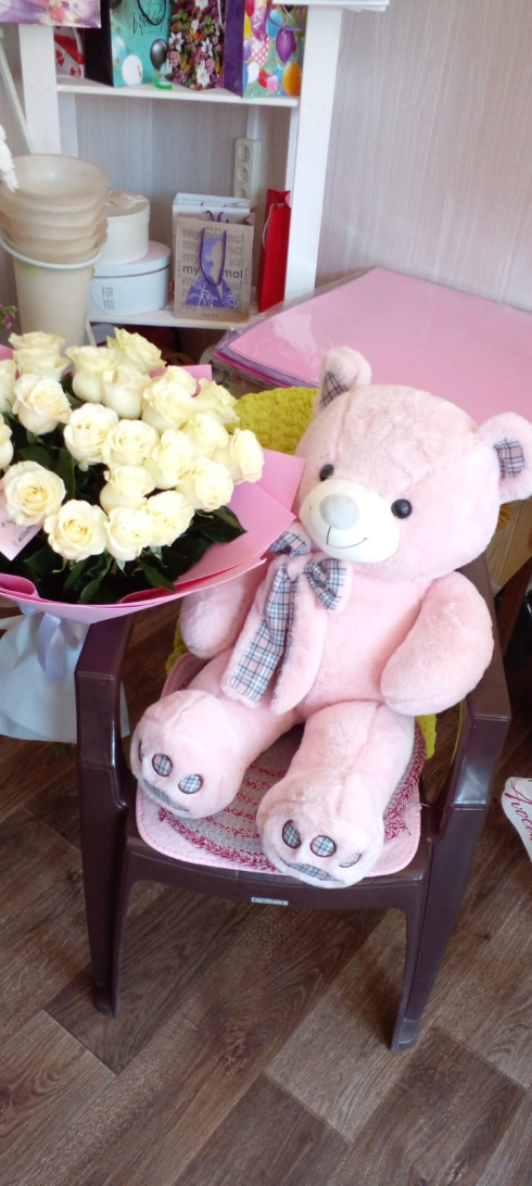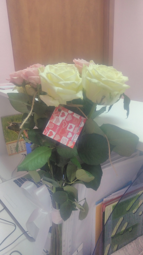 Я покупал букет из красных роз + метрового мишку. Честно говоря, меня мишка сильнее порадовал, поскольку я цветы не очень люблю, но и они были вроде красивые, на мой скверный оценочный взгляд.