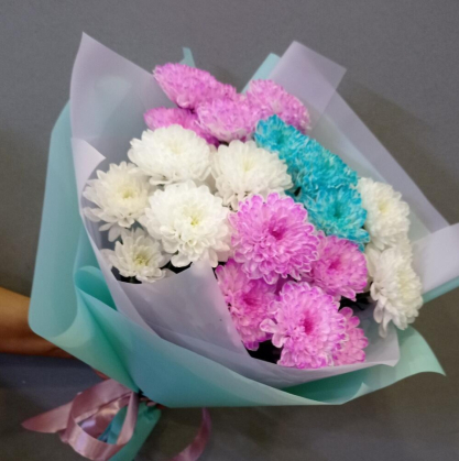 Яркий букет из белых, розовых и голубых хризантем, оформленный в нежную мятную упаковку с лентой. Идеальный подарок для радостного настроения и приятных сюрпризов!