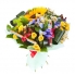 Букет с подсолнухом, кустовой розой, хризантемой, ирисами, гиперикумом и ромашкой с добавлением залени и декорированный карандашами