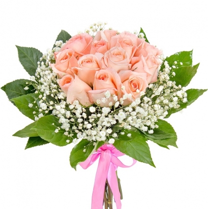 Букет из нежно-розовых роз с добавлением гипсофилы и салала
