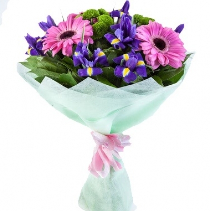 Сказочный и в тоже время романтичный букет, сочетающий в себе ирисы, герберы, кустовые хризантемы Филин Грин и салал, упакованный в нежный фетр.