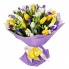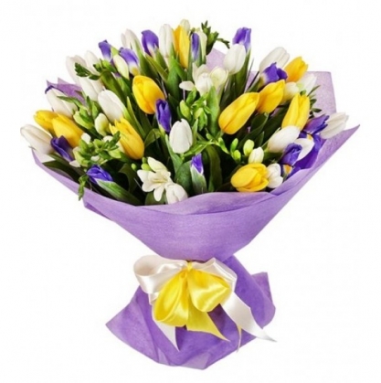 Весенний букет "Три желания", состоящий из трех видов цветов: удивительные тюльпаны, белые фрезии и синие ирисы.